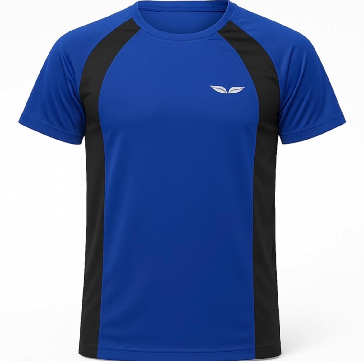 This men's quick-dry sports t-shirt features a vibrant blue main body with contrasting black panels on the sides and under the arms, extending up to the collar. It has a classic crew neck and short sleeves. A white stylized wing logo is prominently displayed on the left chest. Made from a breathable, moisture-wicking fabric, it's designed for comfort and performance during physical activities.